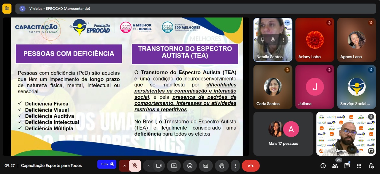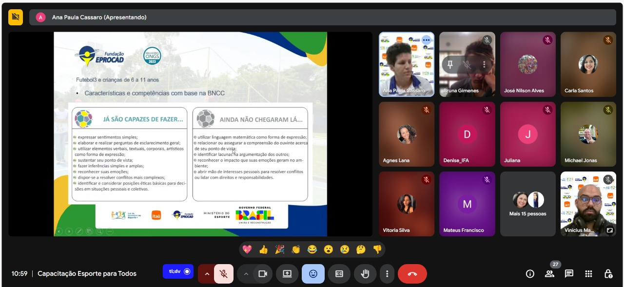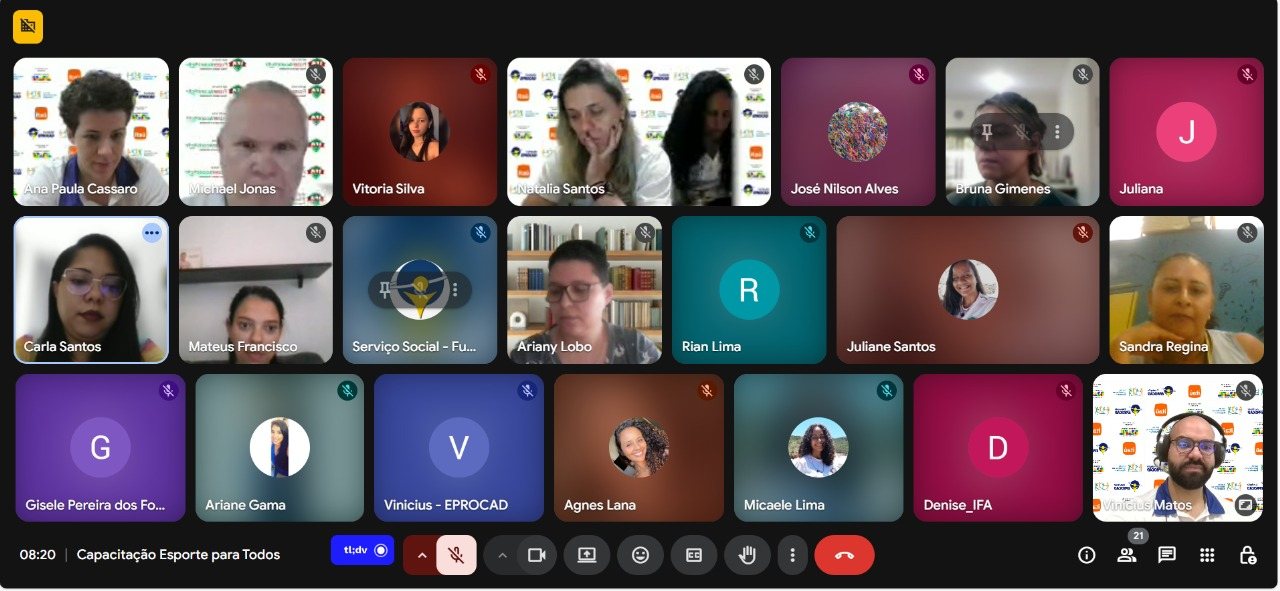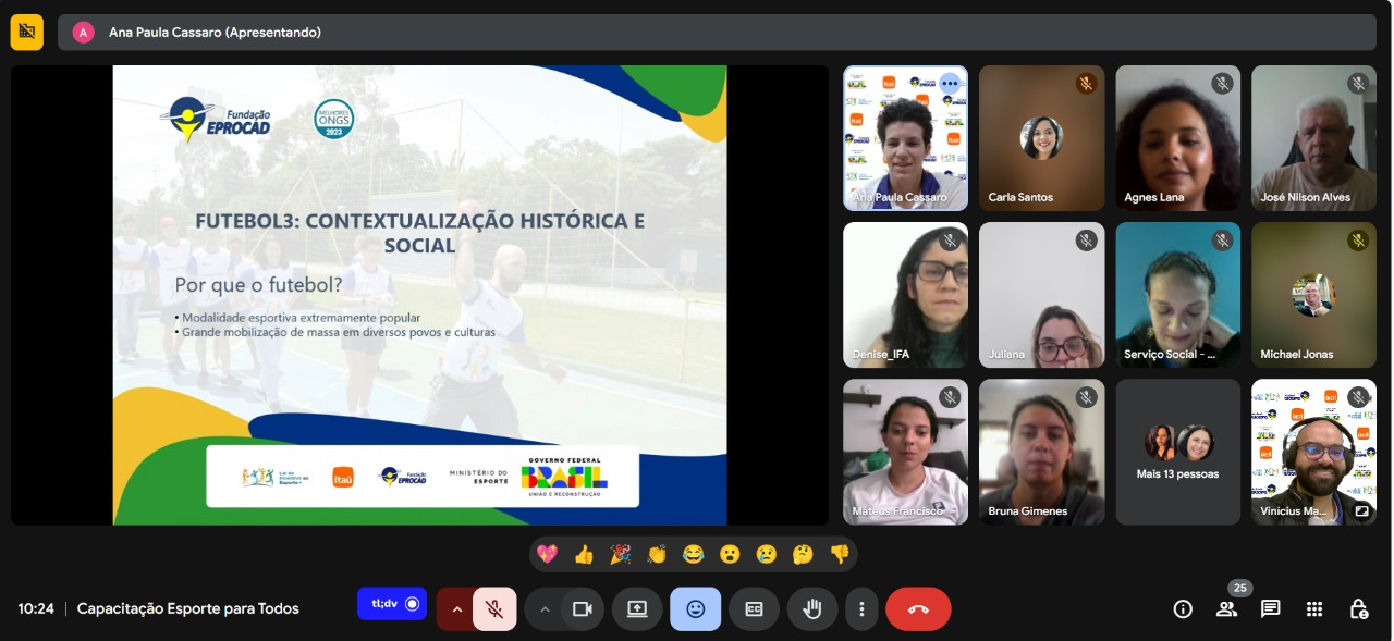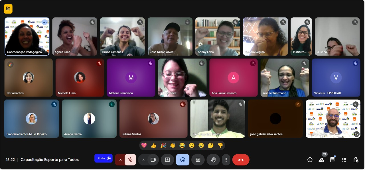 No dia 26/08, realizamos a 6ª formação do projeto “Ano II – Capacitação Esporte Para Todos”, em um encontro online que reuniu organizações de diferentes estados do Brasil. Essa iniciativa é realizada em parceria com o Itaú, por meio da Lei Federal de Incentivo ao Esporte, ampliando nosso impacto positivo nas comunidades atendidas.